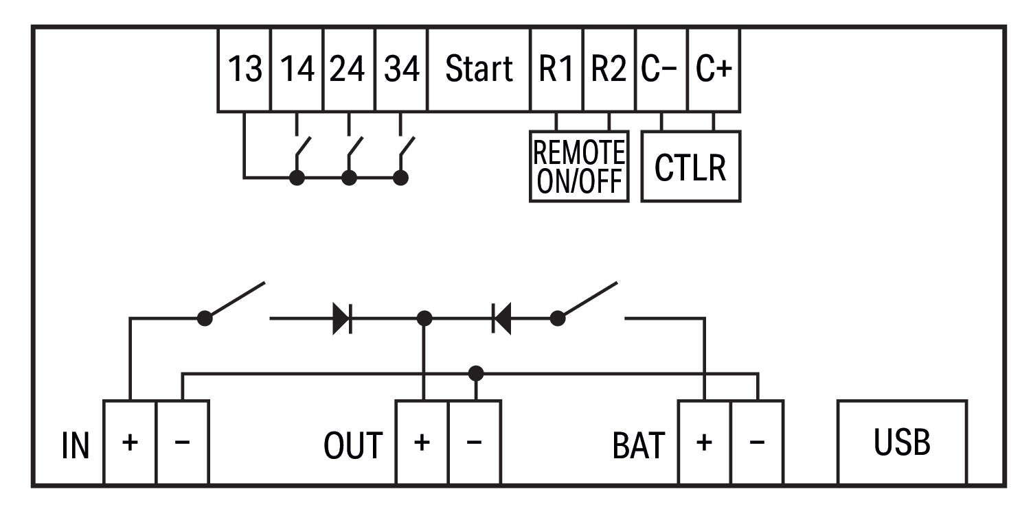 | 1 x tiếp điểm thường đóng (NC) cho tắt từ xa trong chế độ buffer | |
