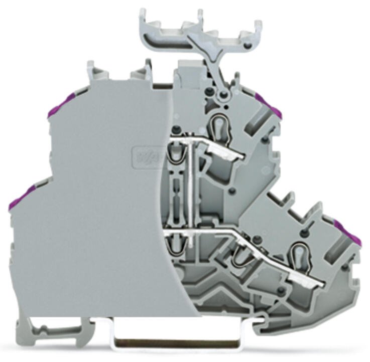 Double-deck terminal block; 4-conductor through terminal block; with end plate; L; with marker carrier; internal commoning; conductor entry with violet marking; for DIN-rail 35 x 15 and 35 x 7.5; 2.5 mm²; Push-in CAGE CLAMP®; 2,50 mm²; gray