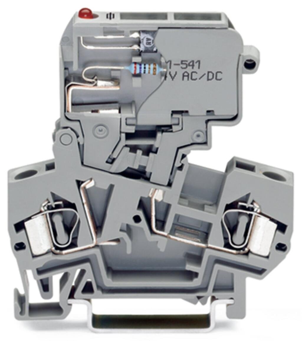 2-conductor fuse terminal block; with pivoting fuse holder; for 5 x 20 mm miniature metric fuse; with blown fuse indication by LED; 30 – 65 V; for DIN-rail 35 x 15 and 35 x 7.5; 4 mm²; CAGE CLAMP®; 4,00 mm²; gray
