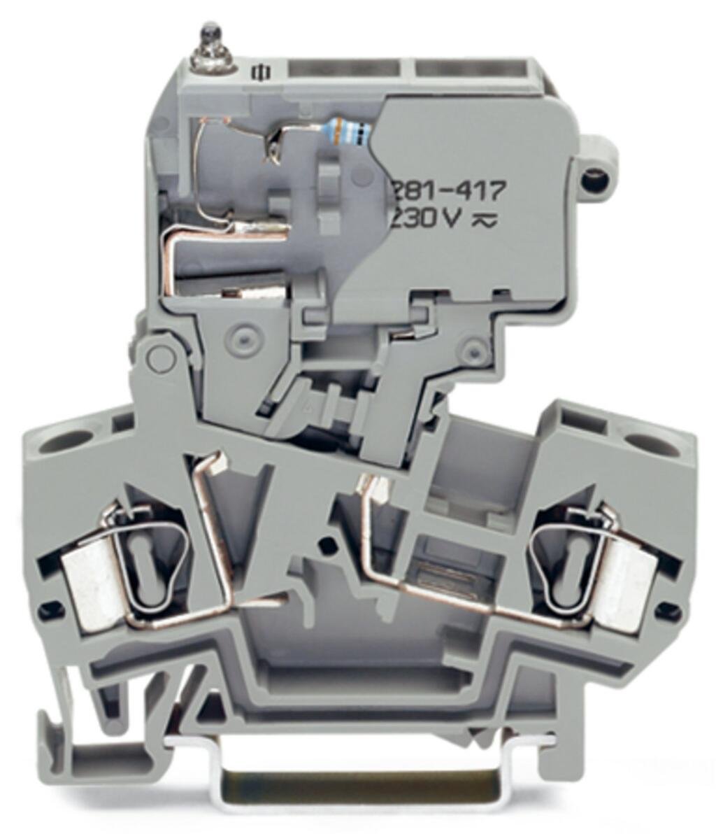 2-conductor fuse terminal block; with pivoting fuse holder; with blown fuse indication by neon lamp; 230 V; for DIN-rail 35 x 15 and 35 x 7.5; 4 mm²; CAGE CLAMP®; 4,00 mm²; gray
