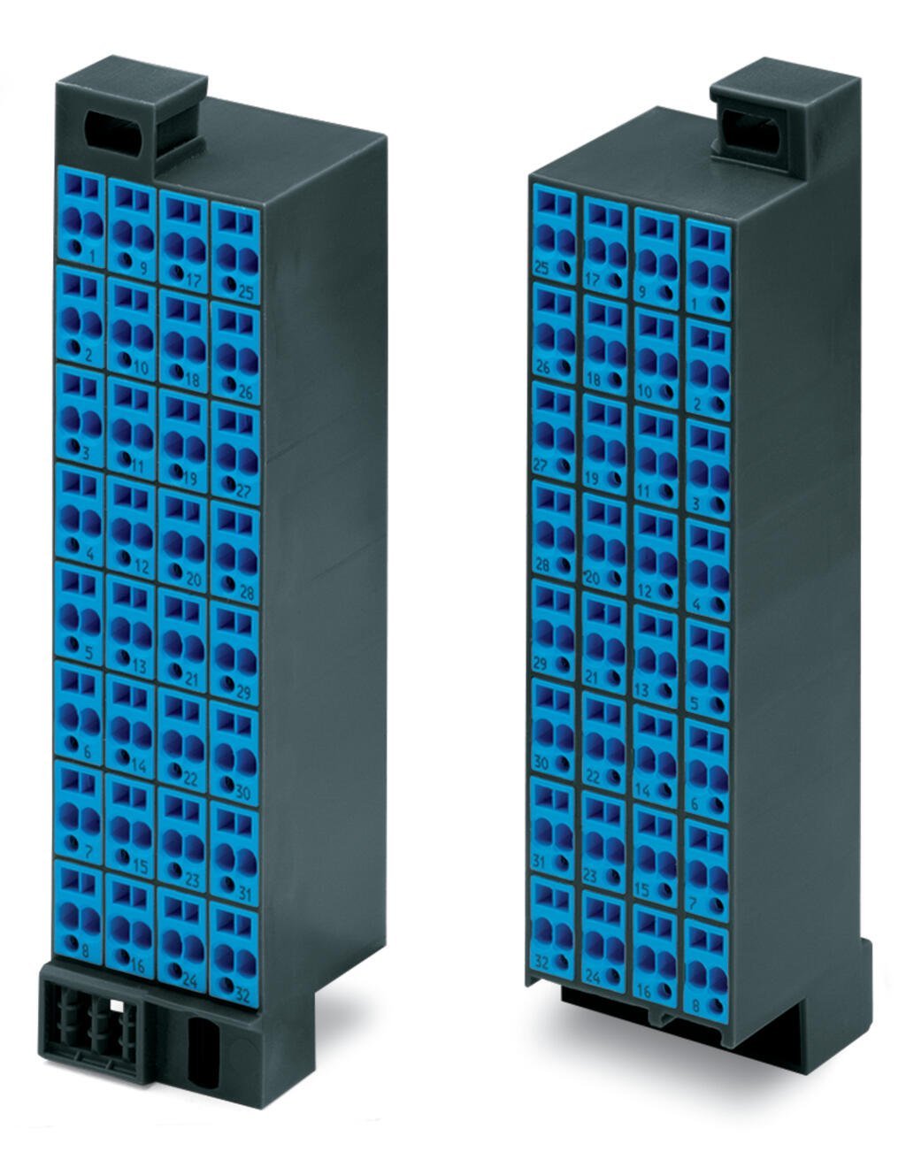Matrix patchboard; 32-pole; Marking 1-32; suitable for Ex i applications; Color of modules: blue; Module marking, side 1 and 2 vertical; for 19″ racks; 180° rotated; 1,50 mm²; dark gray
