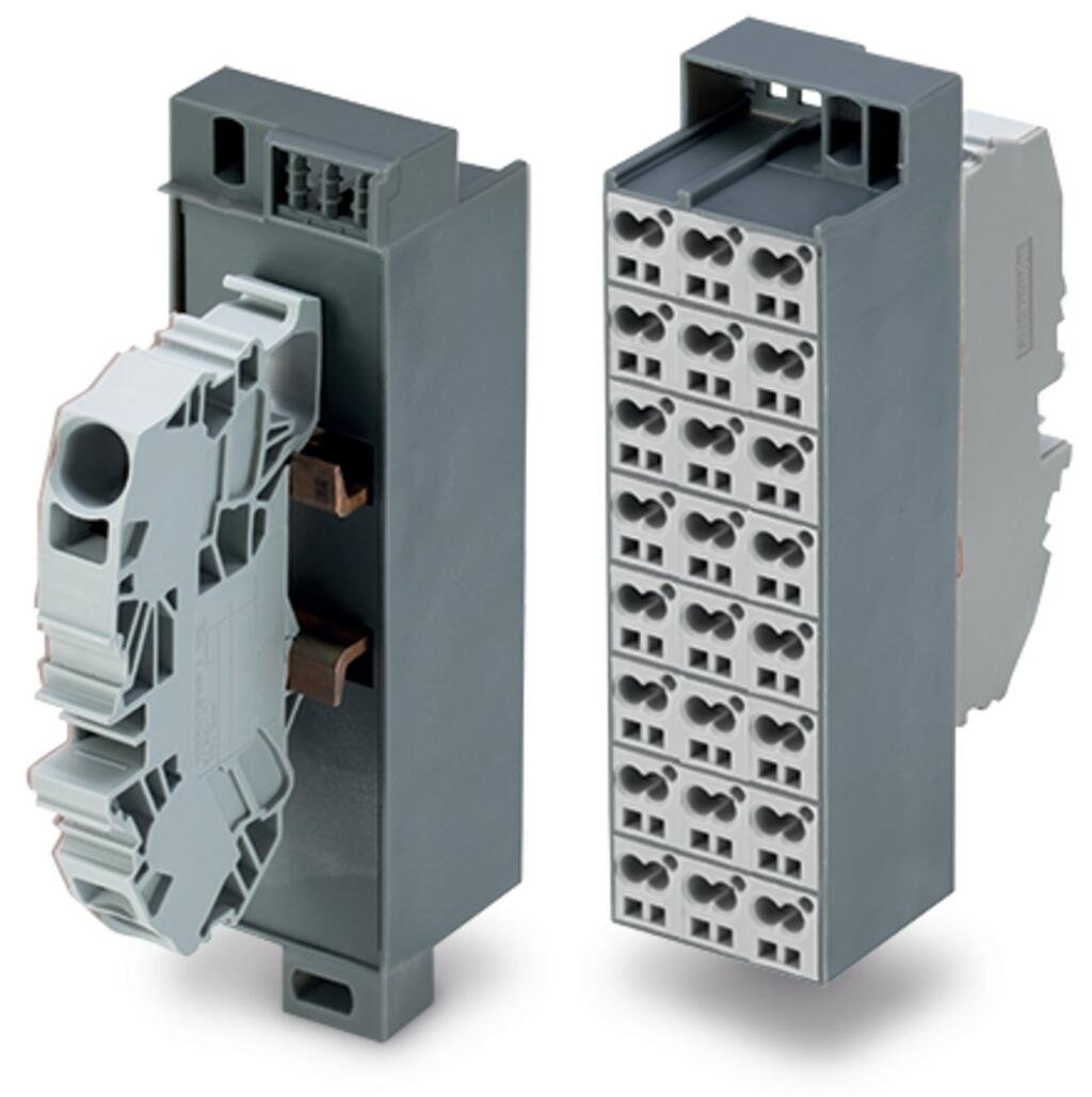 Common potential matrix patchboard; Marking 1-24; with 1 input module incl. end plate; Color of modules: gray; Numbering of modules arranged vertically; for 19″ racks; Slimline version; 16,00 mm²; dark gray