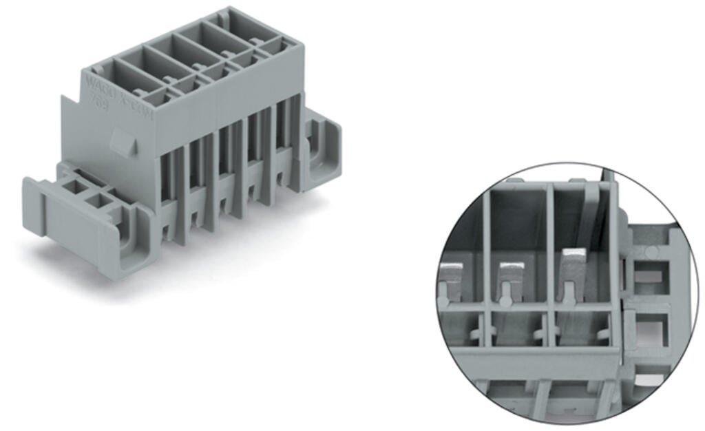THT male header; 1.0 x 1.0 mm solder pin; straight; Preceding ground contact; clamping collar; Pin spacing 5 mm; 6-pole; green-yellow, gray
